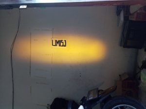 Cahaya lampu yang dihasilkan ini tidak bulat tetapi kotak persegi panjang, dan sedikit menyebar, karena menggunakan lensa khusus, bukan fokus titik